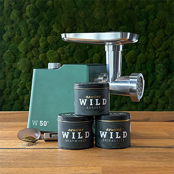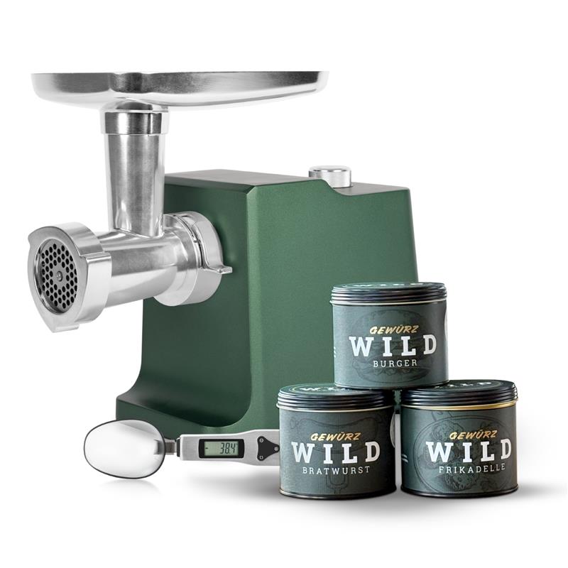 Mit dem kompakten Fleischwolf W 50 in attraktivem Jagdgrün, unseren Bestseller Gewürzmischungen Wildbratwurst, Wildburger und Wildfrikadelle und der exakten Löffelwaage aus Edelstahl gelingen die ersten Wildgerichte im Nu.